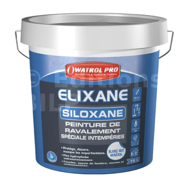ELIXANE est une peinture de ravalement de façades type D2 à base de résines siloxanes en dispersion aqueuse. Dotée d’un excellent pouvoir masquant, elles protège et décore les façades neuves ou à entretenir/rénover, les salissures et l’encrassement atmosphérique ne peuvent pas se fixer, les pluies battantes ruissellent sans pénétrer grâce au film hydrophobe.