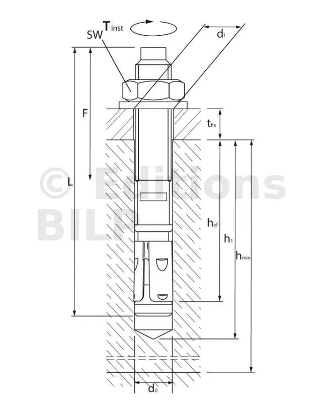 | Références | Ø perçage [d0] [mm] | Prof. min. de perçage [h1] [mm] | Ø perçage dans pce à fixer (au travers) [df] [mm] | Ouverture de clé sur plat [SW] [mm] | Couple de serrage [Tinst] [Nm] | Prof. ancrage [hef] [mm] | Ep. mini du support [hmin] [mm] | Distance entraxes caractéristique(5) [scr,N] [mm] | Distance au bord caractéristique [ccr,N] [mm] |