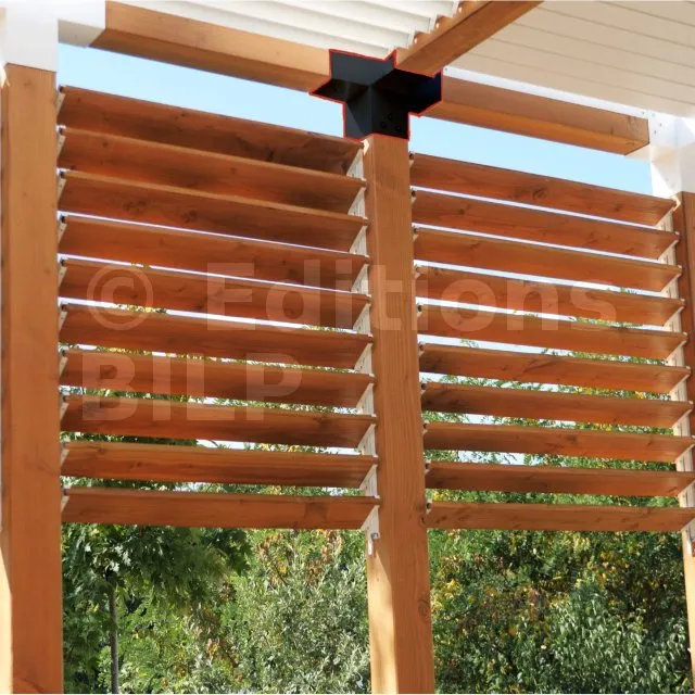 Il permet de raccorder une poutre de 90x90mm perpendiculairement à un chevron de 90x90mm, le tout étant supporté par un poteau vertical de 90x90mm.