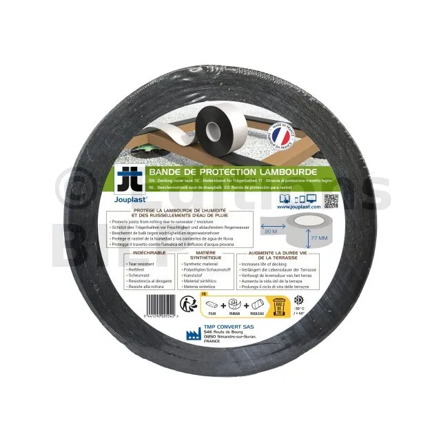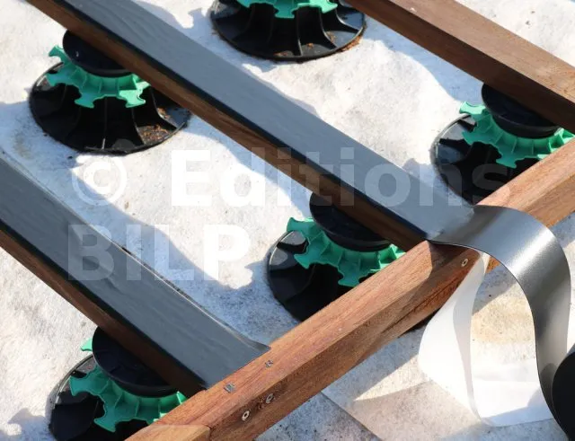 Cette bande a pour rôle d’étanchéifier les lambourdes constituant la structure de votre terrasse pour rendre votre ouvrage plus pérenne. En effet, les ruissellements des eaux de pluie ne vont plus s’attaquer aux lambourdes, ce qui évitera le pourrissement de ces derniers.