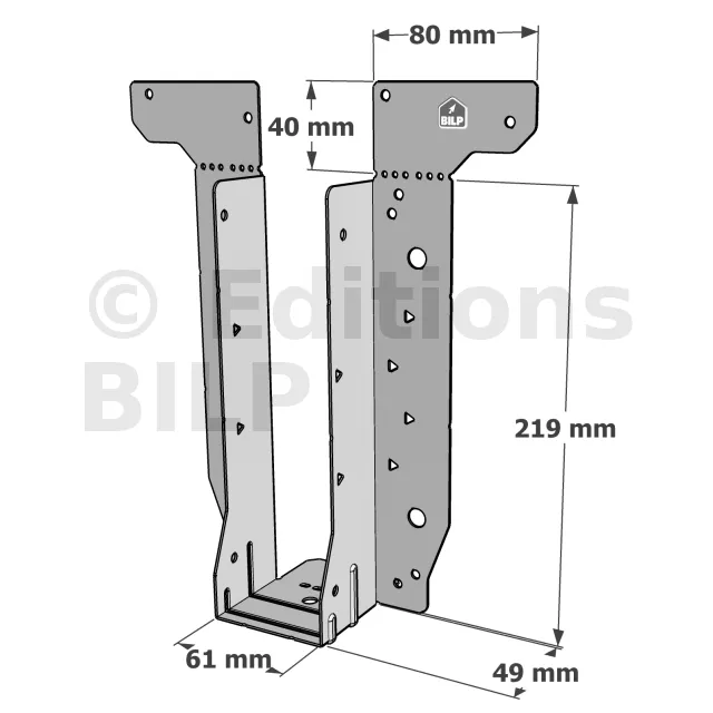 - Étrier fourni avec ses brides supérieures droites, pliables sur chantier afin de s’adapter à toutes les hauteurs de solives,