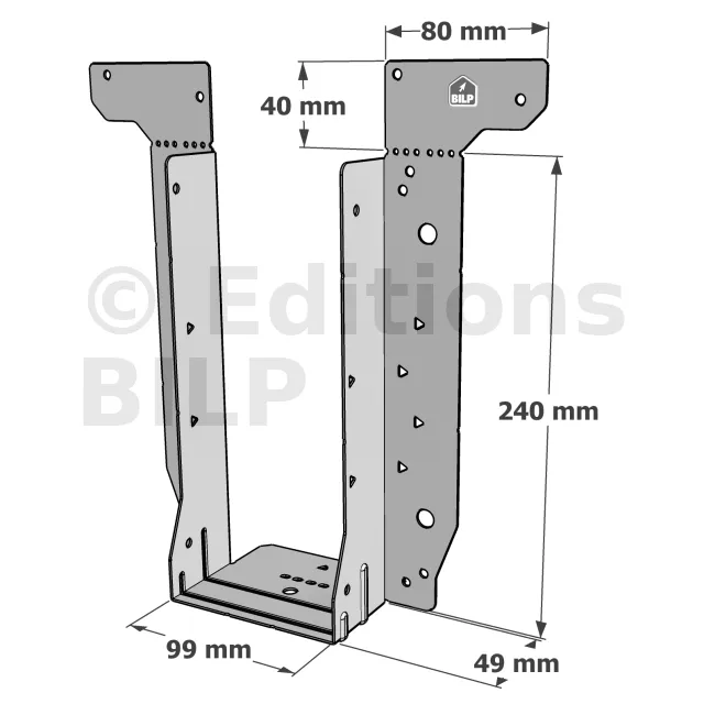 - Étrier fourni avec ses brides supérieures droites, pliables sur chantier afin de s’adapter à toutes les hauteurs de solives,
