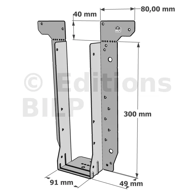 - Étrier fourni avec ses brides supérieures droites, pliables sur chantier afin de s’adapter à toutes les hauteurs de solives,