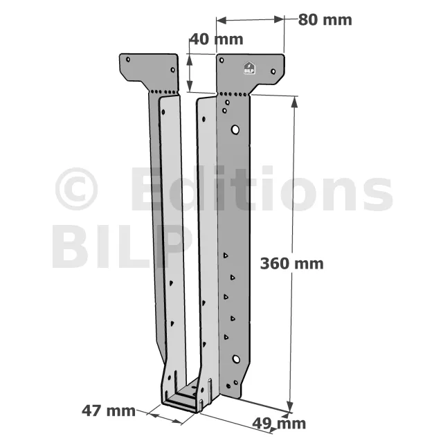 - Étrier fourni avec ses brides supérieures droites, pliables sur chantier afin de s’adapter à toutes les hauteurs de solives,