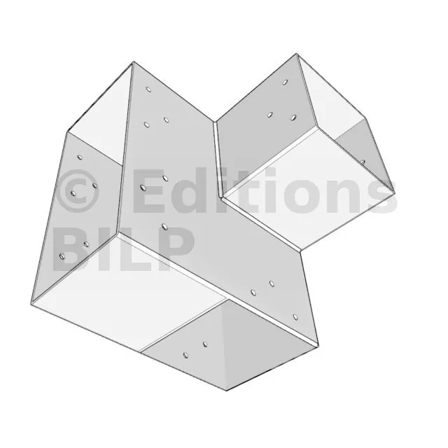 Il est utilisé dans un angle extérieur. Ce connecteur va permettre de raccorder une grosse poutre 240x120mm perpendiculairement à une poutre 120x120mm, le tout étant supporté par un poteau vertical 120x120mm.