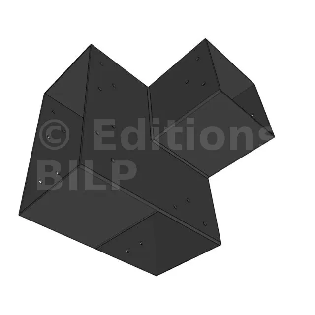 Il est utilisé dans un angle extérieur. Ce connecteur va permettre de raccorder une grosse poutre 240x120mm perpendiculairement à une poutre 120x120mm, le tout étant supporté par un poteau vertical 120x120mm.