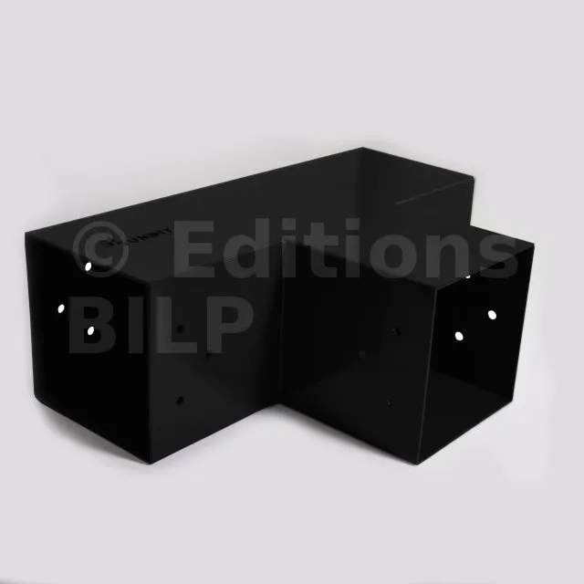 Il sert à raccorder une poutre de 90x90mm perpendiculairement à une autre poutre de 90x90mm, SANS être soutenu par un poteau vertical. Il permet également la connexion d’une longue poutre de 90x90mm à un poteau intermédiaire de 90x90mm.