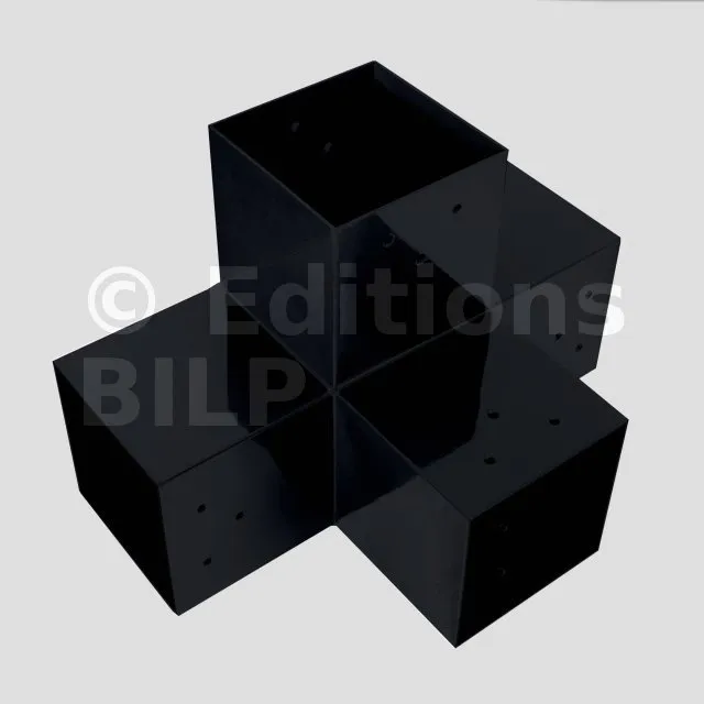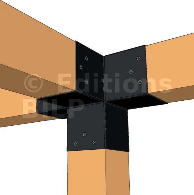 Il permet de raccorder une poutre de 90x90mm perpendiculairement à un chevron de 90x90mm, le tout étant supporté par un poteau vertical de 90x90mm.