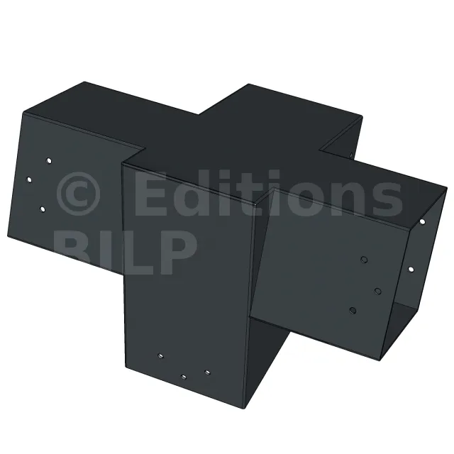 Connecteur d’angle intérieur à quatre directions conçu pour l’assemblage de poutres en section 120x120 mm avec un chevron de même section incliné à 20°. Il assure la jonction structurelle entre les éléments horizontaux, le chevron incliné et un poteau porteur vertical en 120x120 mm.
