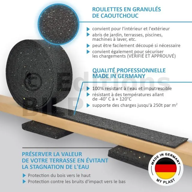 Protégez vos lambourdes et prolongez la durée de vie de votre terrasse grâce à ce rouleau en granulé de caoutchouc. Antidérapant, isolant et résistant aux intempéries, il offre une protection efficace contre l’humidité et facilite la pose de vos aménagements extérieurs.