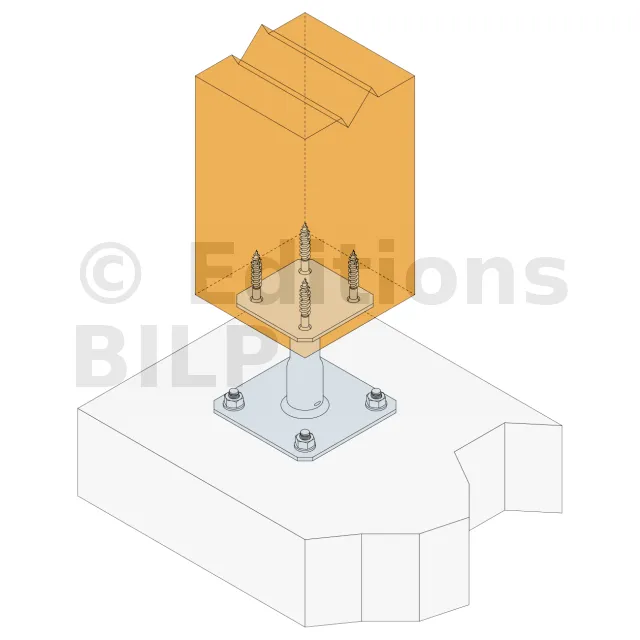 2. Fixer cette platine au poteau à l’aide de tirefonds ou SSH Ø10x50 (pré-perçage nécessaire).