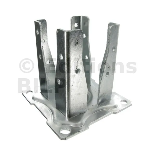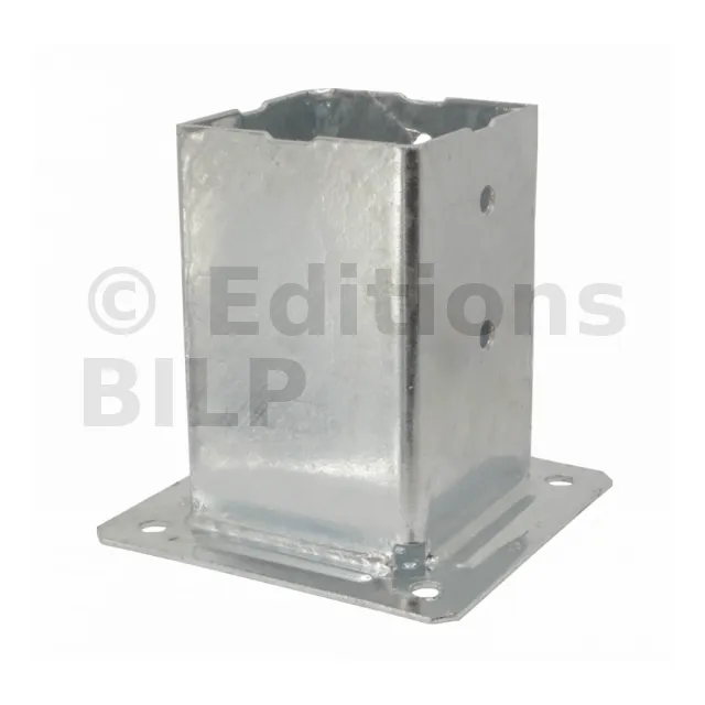| Pied de poteau carré à boulonner PPJBT100 | Largeur 102 mm ; platine 200 × 200 mm pour meilleure stabilité des poteaux porteurs ; acier DD11 + galvanisation ; 4 perçages Ø12 mm et hauteur 150 mm. |