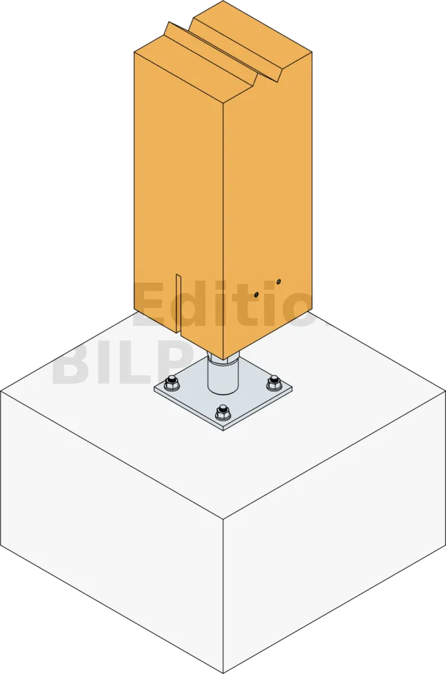 La connexion entre le pied de poteau et le poteau bois s’effectue à l’aide des deux broches supérieures.