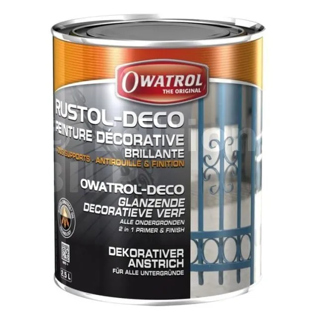 RUSTOL-DÉCO est une peinture antirouille disponible en brillant, mat, satin et également en trois teintes micacées brillant. Ce produit assure une protection antirouille renforcée et décorative sur tous supports.