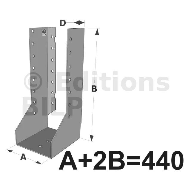 Attention, pour les sabots SAIX à ailes intérieures de largeurs inférieures à 80 mm, les ailes sont recoupées sur la hauteur dans l’axe des perçages de boulons. La fixation sur le porteur est donc uniquement possible par pointes ou vis dans la ligne verticale de perçages Ø5 proche du pli.