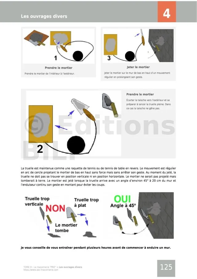 Avec cet ouvrage, vous réaliserez un mur de clôture et ses piliers, des allées avec palier et quelques marches, la réfection d’un dallage d’un appentis, une terrasse, des enduits, des chapes et enfin tous les travaux d’extension et de rénovation et toutes les diverses finitions.