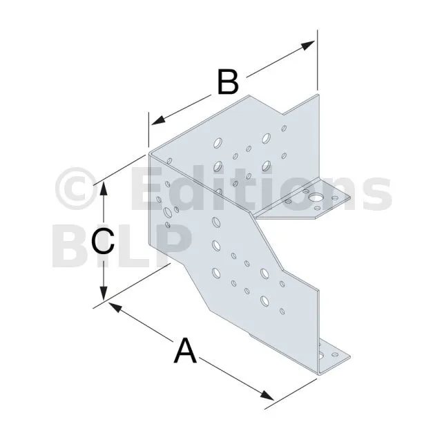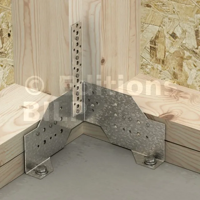 Le connecteur pour panneau bois FCC assure la liaison de murs d‘ossature sur dalle béton. Les trous de pointes et de boulons permettent d‘adapter la fixation en fonction des configurations. Cette référence peut éventuellement être associée à un feuillard perforé type FP30 à fixer sur les montants.