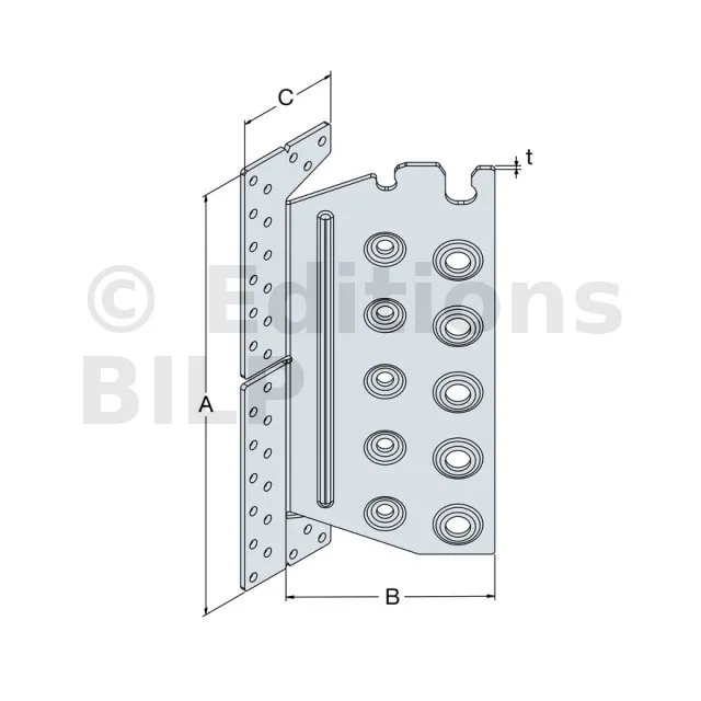 | Largeur | Hauteur | Largeur poteau | A | B | C | t | α [°] | Ø5 | Ø8,5 | Ø12,5 | ||||||