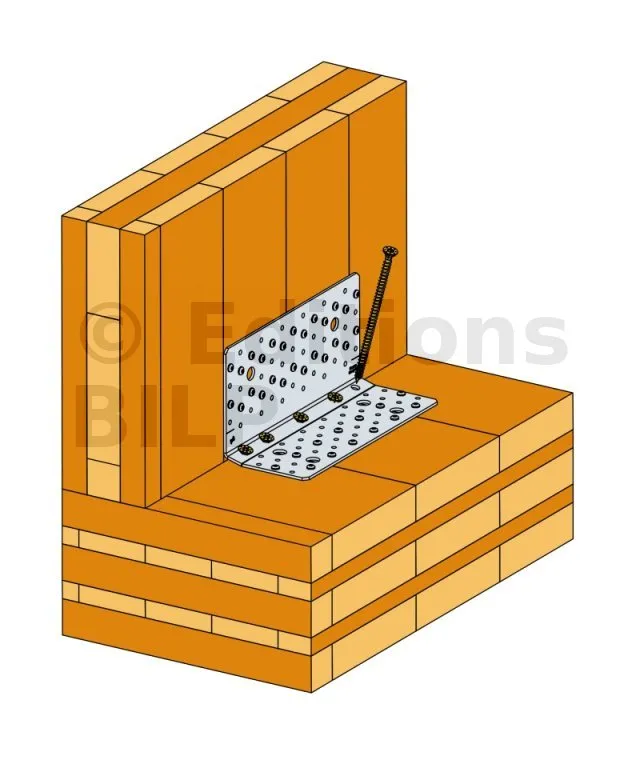 3- Insérer ensuite les vis filetage total dans les perçages proches du pli à un angle d’environ 70° (l’utilisation d’un gabarit est recommandé pour plus de rapidité et de précision).