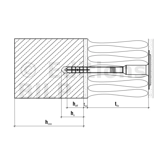 Longueur minimale de la cheville Ld = tfix + ttol + heff avec tfix : épaisseur maximale des pièces à fixer, ttol : épaisseur des sous-couches (adhésif + enduit existant), heff : profondeur d’ancrage.