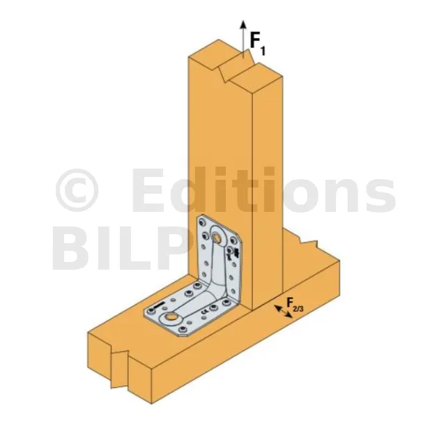 Seuls les efforts F1, F2 et F3 pour des assemblages à 2 équerres sont présents sur cette fiche. Pour plus d’information, consulter l’ETE de Simpson Strong-Tie.