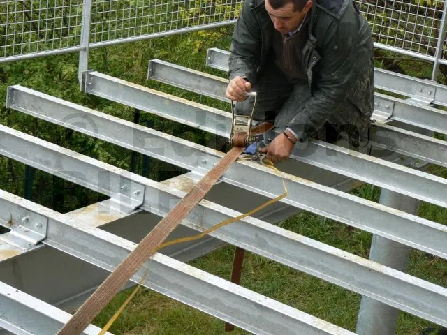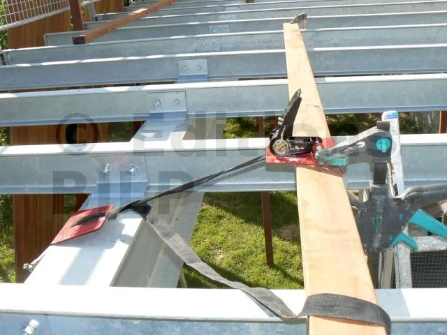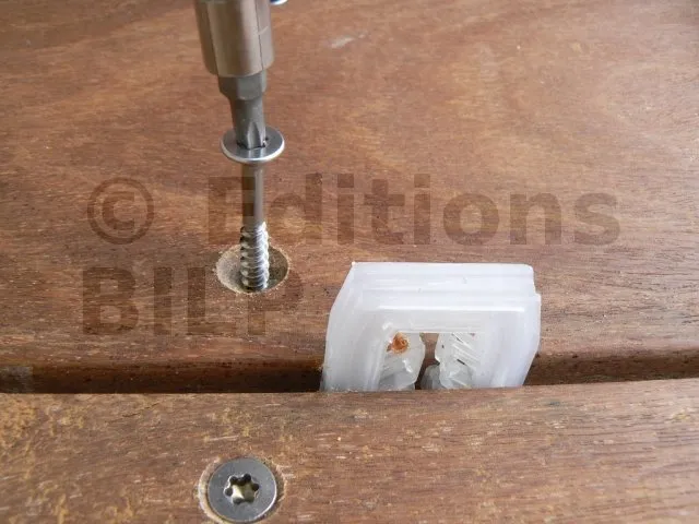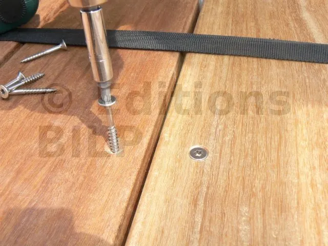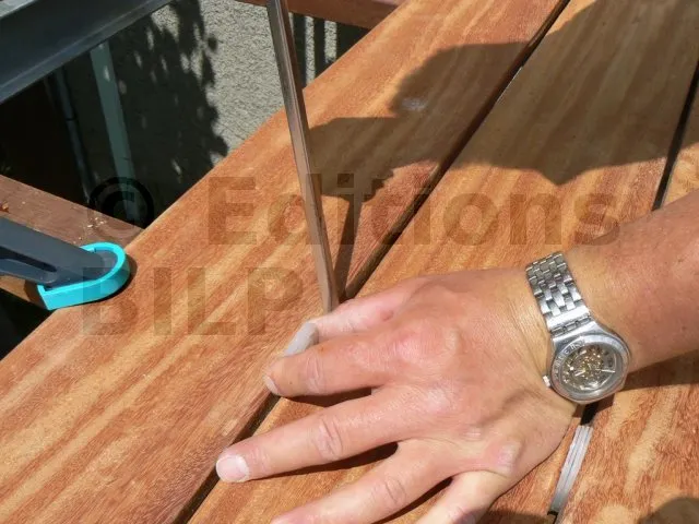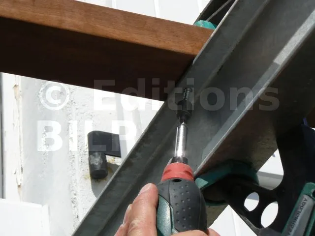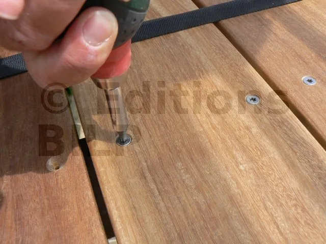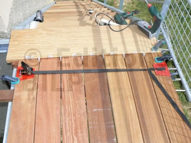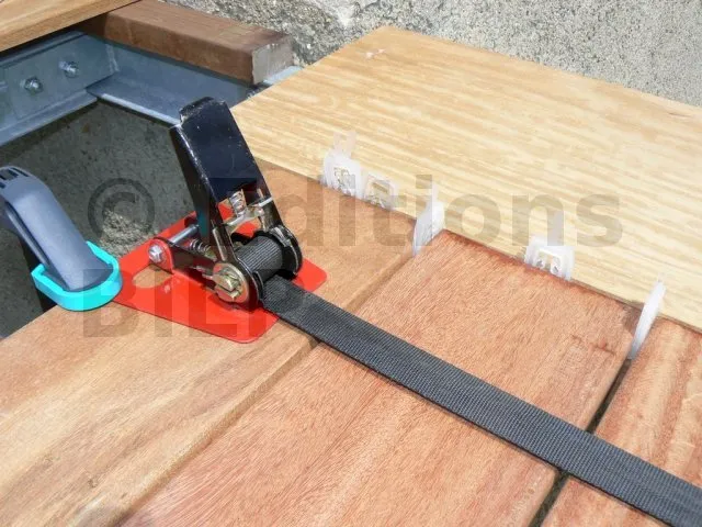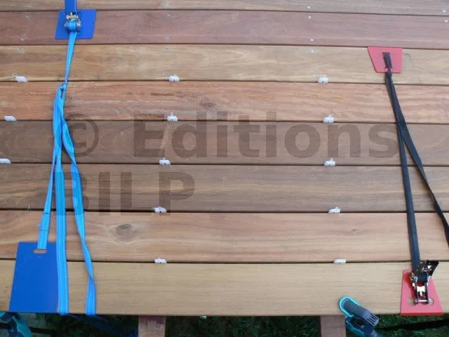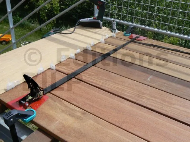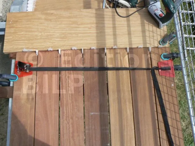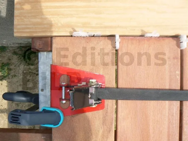 On maintient les lames en pression l’une contre l’autre avec une sangle à parquet, avant vissage