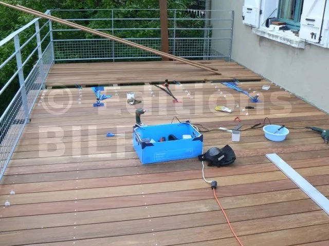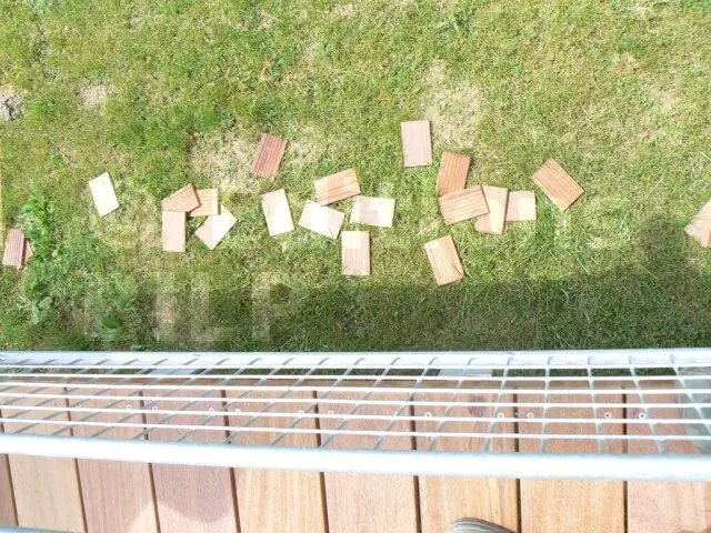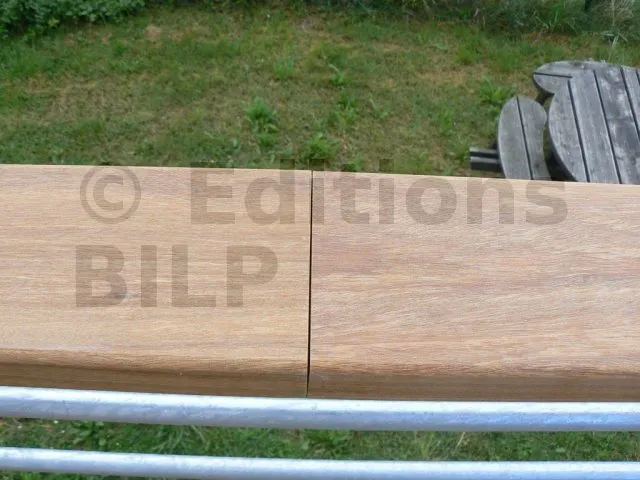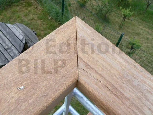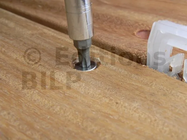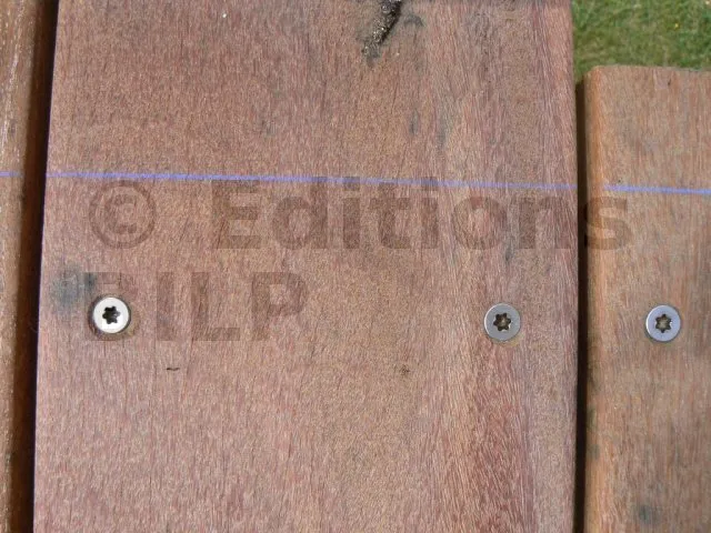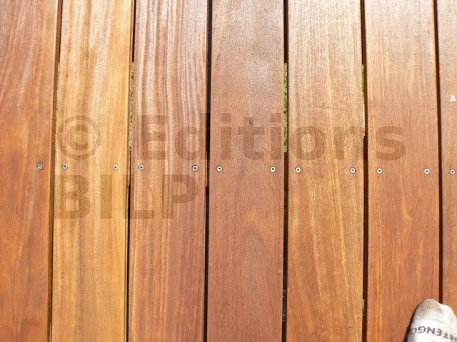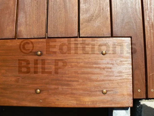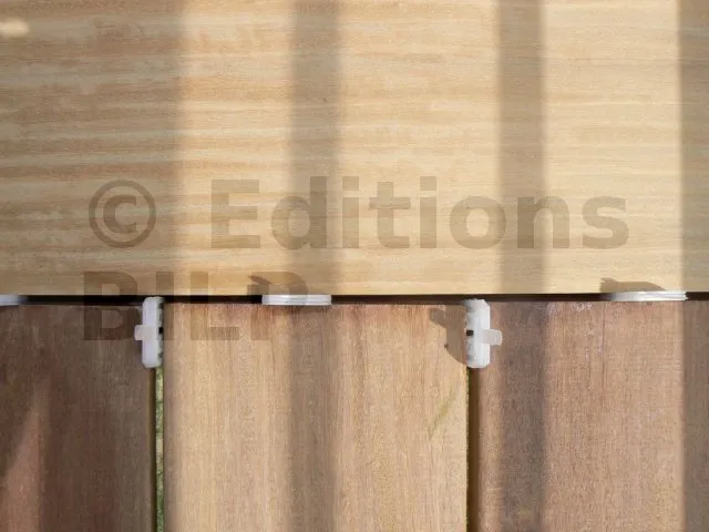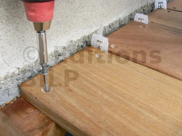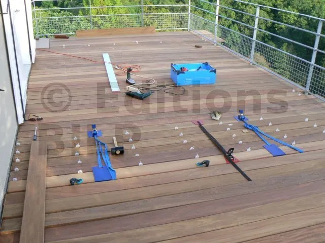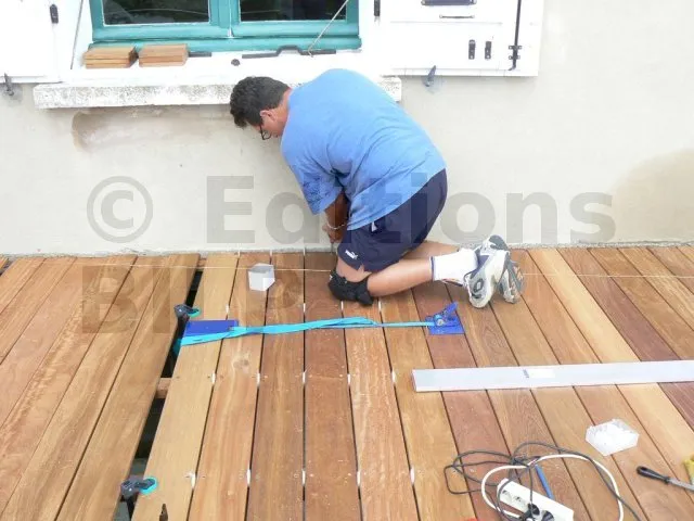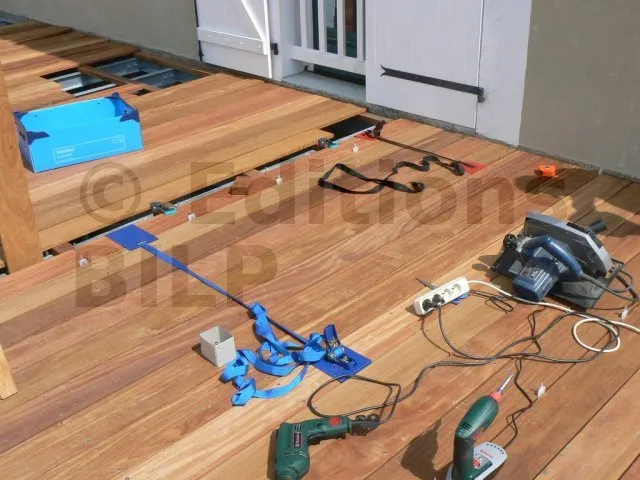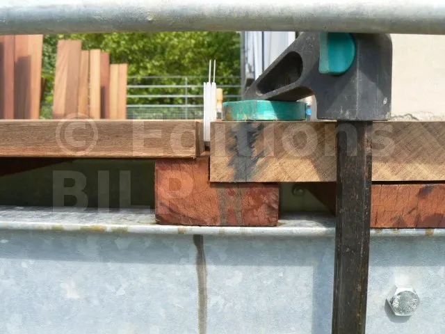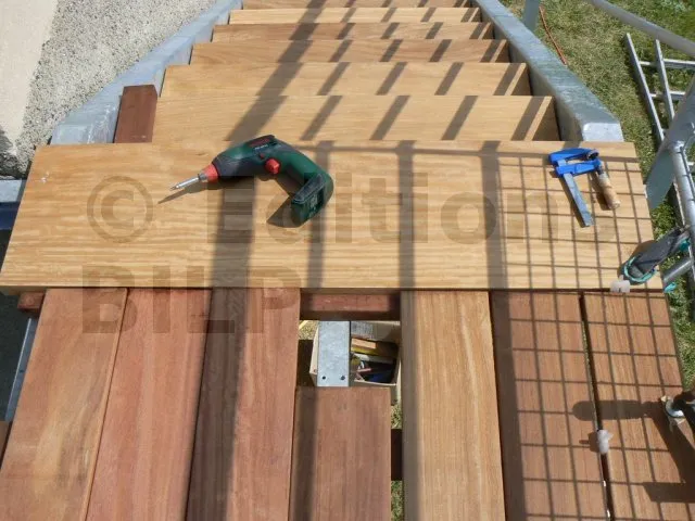 Les lames autour de la dernière marche sont placées très finement grâce à des cales