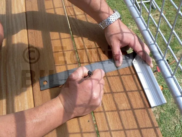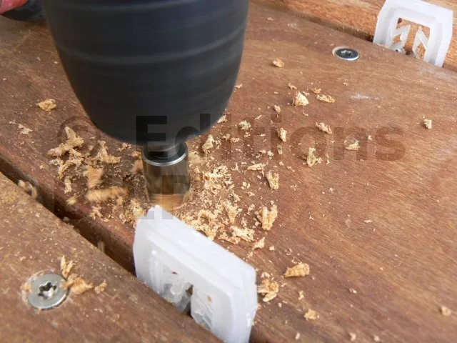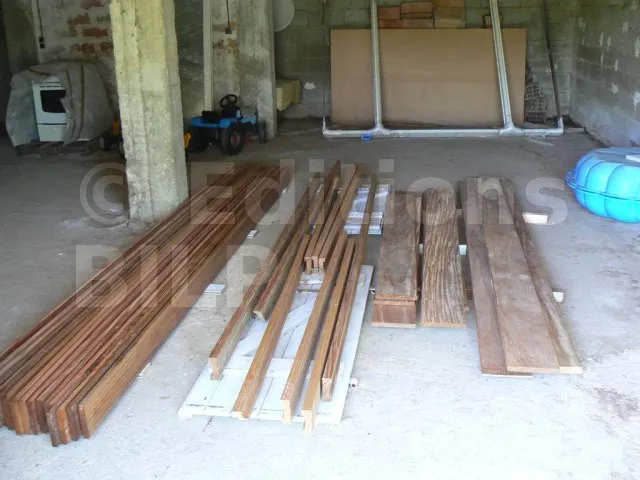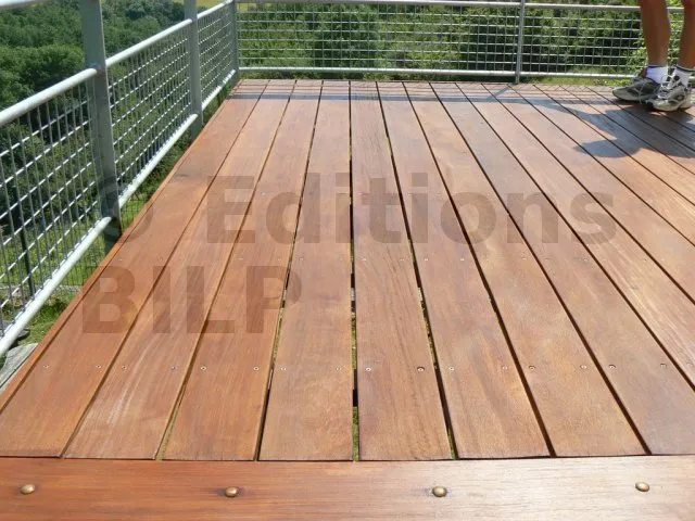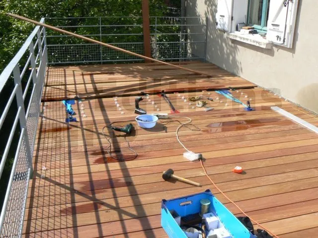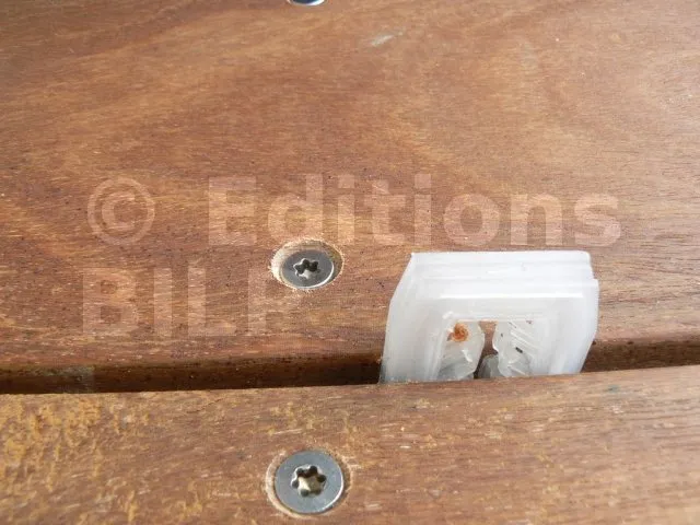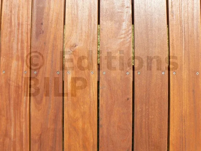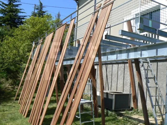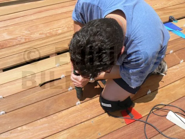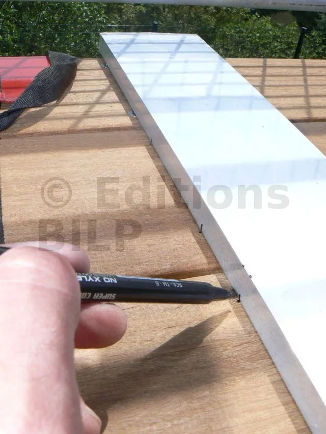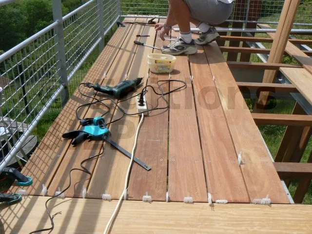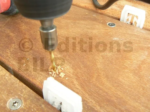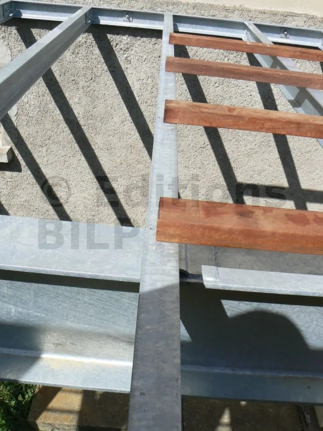 Les lames autour de la dernière marche sont placées très finement grâce à des cales