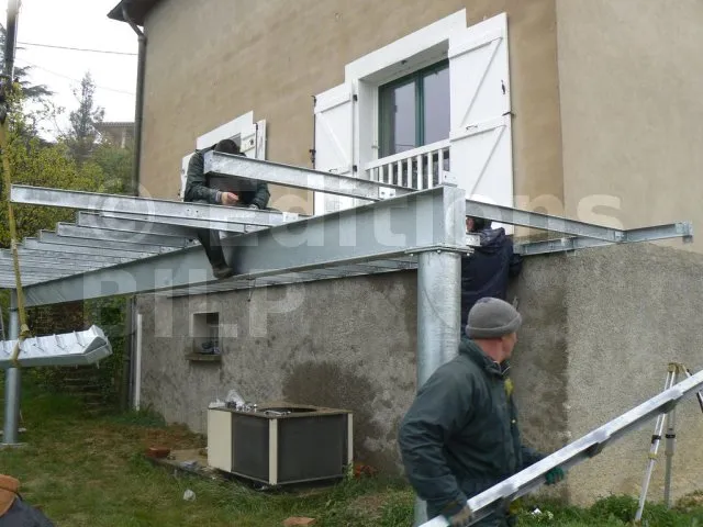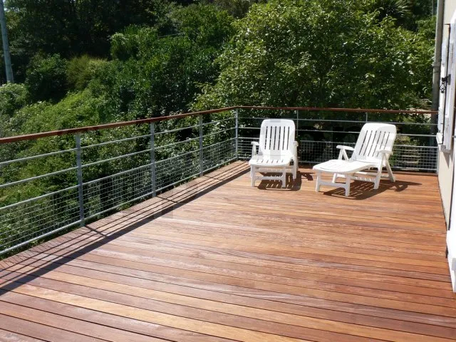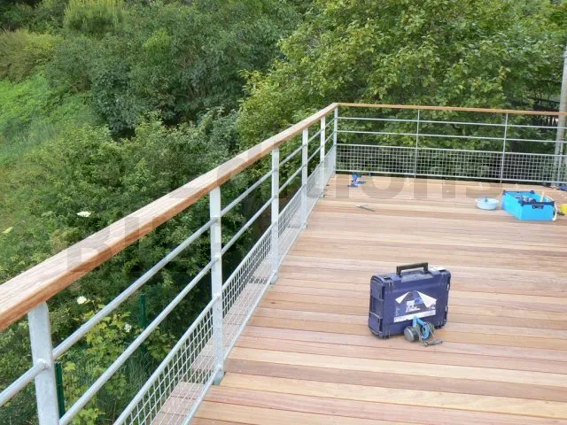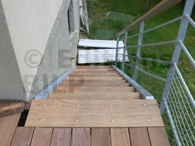Cette terrasse en bois est montée sur une structure métallique. Le résultat est très convaincant.