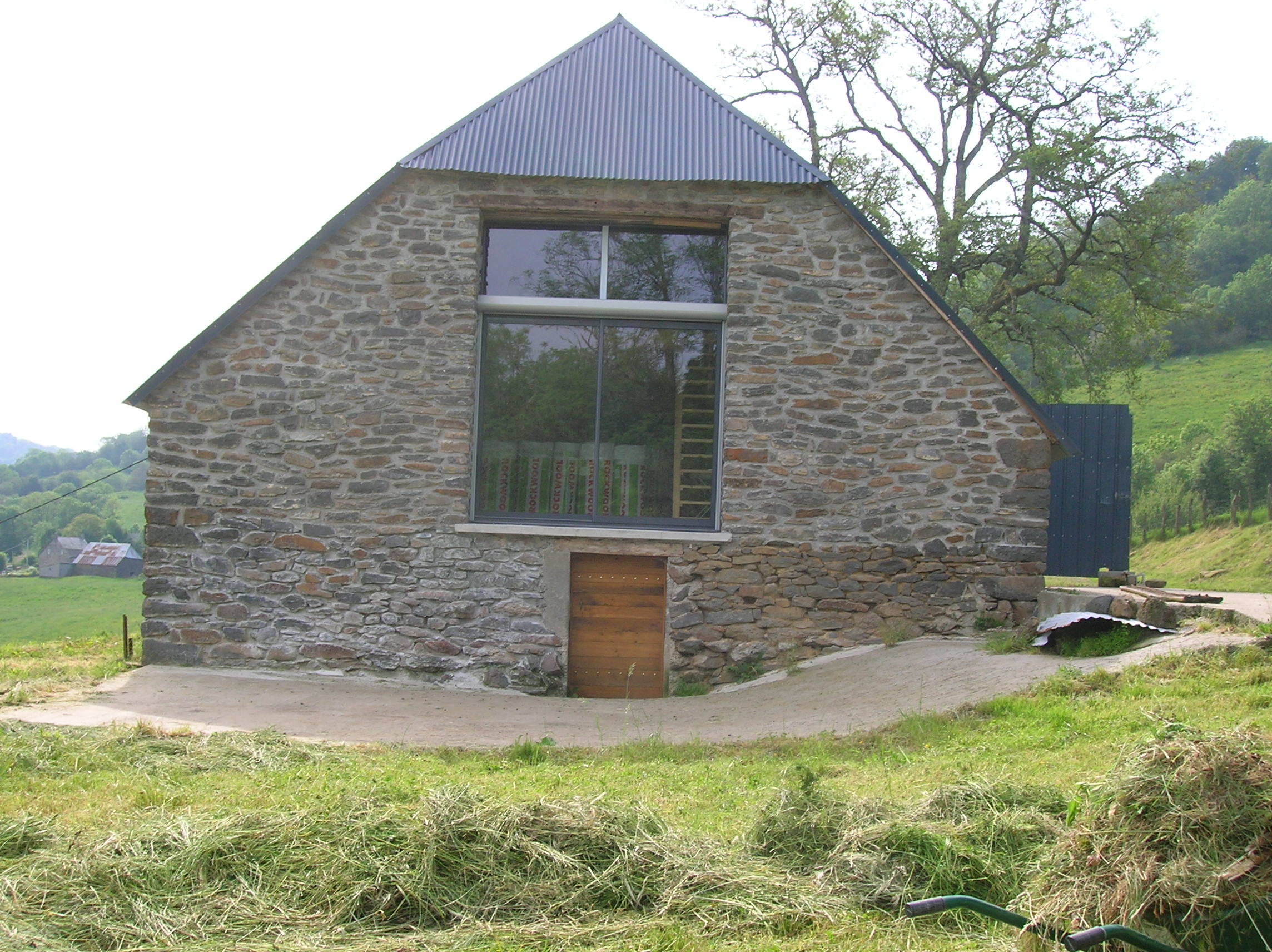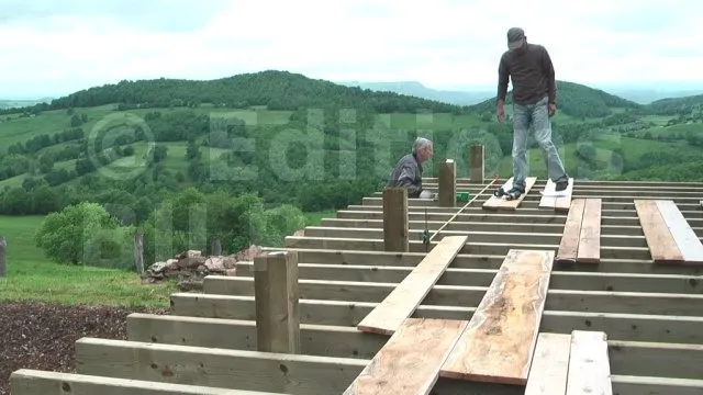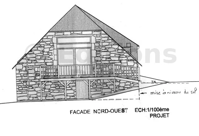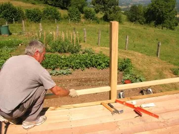 L’orientation du platelage est parallèle au mur de façade. La rangée de poutres porteuses le sera donc aussi. La profondeur est d’environ 4 m. Une seule rangée de porteuses sera nécessaire et on fera un solivage en léger porte-à-faux.