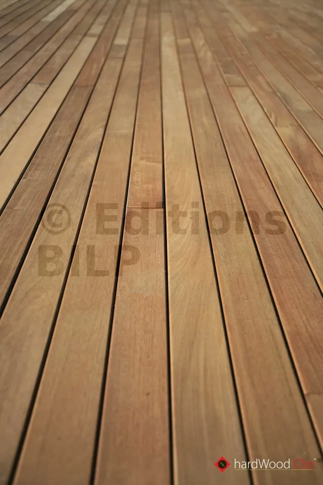 Les fixations invisibles sont apparues très récemment sur le marché. Elles répondent à un double besoin : occulter les fixations dans un but esthétique et faciliter la pose sur chantier. Et il est vrai que ces systèmes simplifient, facilitent et raccourcissent les temps de pose sur chantier. Les fixations invisibles permettent également de limiter la stagnation d’eau aux endroits des fixations. La plupart des systèmes ménagent un espace entre le support (lambourde) et la lame. La pérennité des lames est donc en théorie plus importante qu’avec les fixations traversantes.