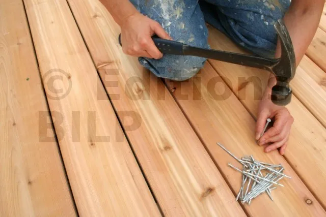 L’outillage est des plus basique : un marteau de charpentier et c’est tout. La mise en œuvre est des plus rapides. Avec un peu d’entraînement, on enfonce une pointe en quelques secondes. Par contre, pour les extrémités des bois de faible épaisseur comme une la lame de terrasse par exemple, un pré perçage permettra d’éviter l’éclatement du bois.