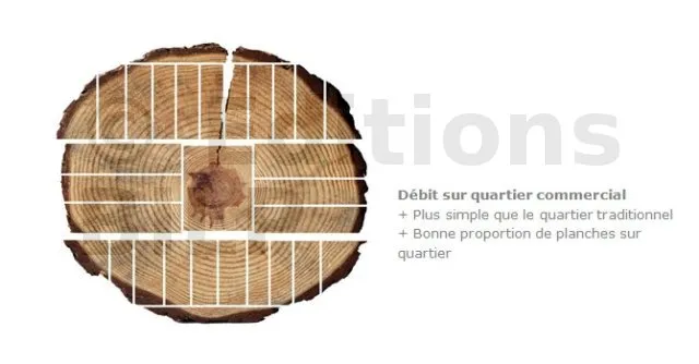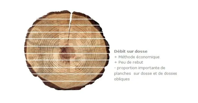Dans les planches sur dosse, les cernes sont globalement parallèles à la largeur de la planche. Ces planches sont plus sujettes aux déformations pendant le séchage que les planches sur quartier. On dit qu’elles tirent au cœur. Dans les planches sur quartier, les cernes sont perpendiculaires à la largeur de la planche. Il s’agit de planches de 1er choix.