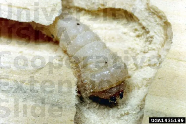 La larve mesure de 15 à 30 mm de longueur (belle bête !). Elle est de couleur blanc ivoire, corps plus large à la tête qu’à l’abdomen. Les trois paires de pattes sur le thorax sont à peine discernables.