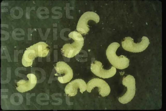 La larve mesure jusqu’à 6 mm de longueur, en forme de ver blanc, blanc ivoire, partie thoracique dotée de 3 paires de pattes bien discernables. Elle se développe pendant un an mais cette durée peut varier en fonction de l’humidité et de la température. Puis elle prend son envol d’avril à juillet.