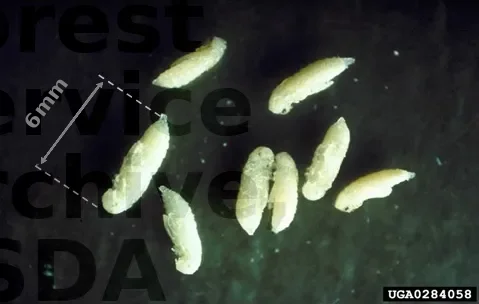 La larve mesure de 4 à 6 mm de longueur, allure de ver blanc, blanc jaunâtre, partie thoracique dotée de trois paires de pattes bien discernables. Envol : d’avril à août.