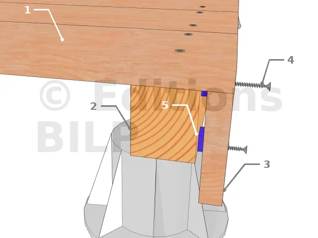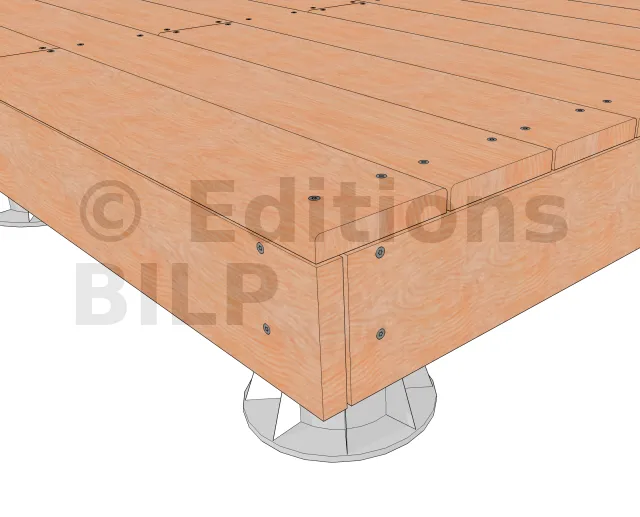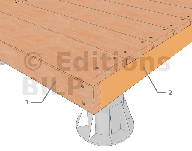 Si la dernière solive sur le côté de la terrasse est de la même essence que le bandeau ou que son aspect s’en rapproche ; il est possible de la mettre à profit en la laissant telle quelle, sans bandeau rapporté. On économise ainsi une longueur de bandeau sur le côté. Cependant, les coins ne peuvent alors pas être traités avec des coupes à 45°.