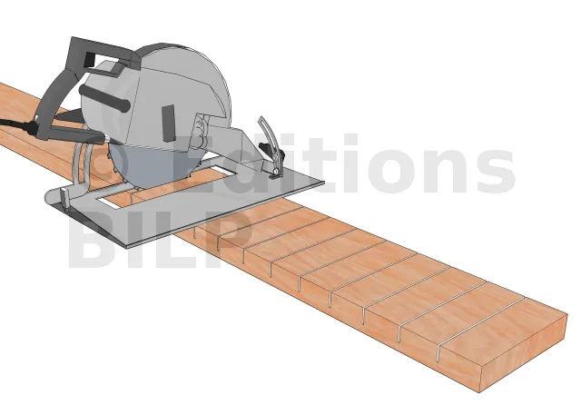 Pour faire les rainures, la scie circulaire électroportative est l’outil de base. Il faut régler la profondeur de coupe. Mais le travail sera plus confortable, plus précis et plus sûr, avec une scie radiale ou une scie de table en atelier.