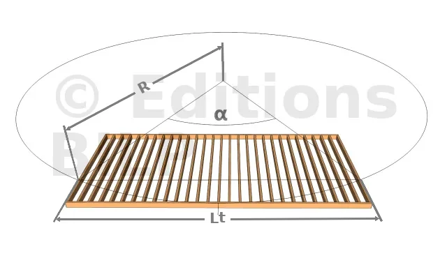Calculons N > 90 / (2 x Arcos(1 – (10/180)) ). Soit N > 2,34. Nous prenons donc la valeur entière immédiatement supérieure, soit 3 solives-bordures.