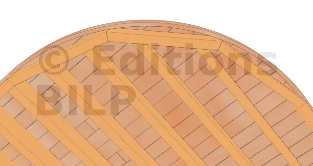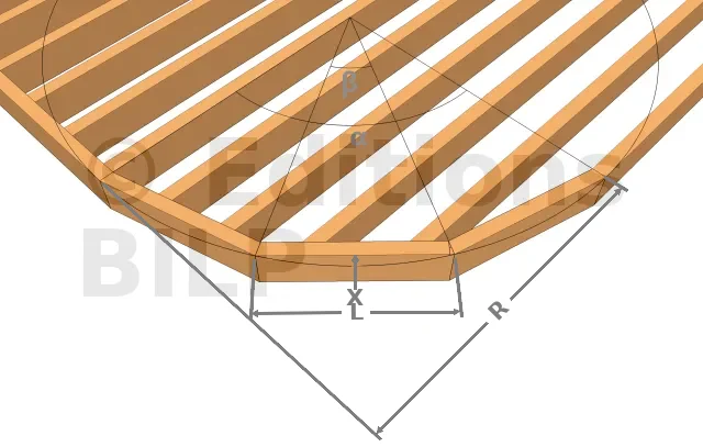 L’effet de courbe est produit d’une part par la coupe en arrondi des lames (ou panneaux) , d’autre part par le bandeau qui est fixé en forçant sa courbure. Mais la structure sous-jacente est très importante. Nous allons placer un certain nombre de solives en bordure, pour suivre autant que possible la courbe. La quantité de solives bordures et leur longueur sont à calculer. Il faut absolument faire un plan. Pas question d’improviser sur le chantier.