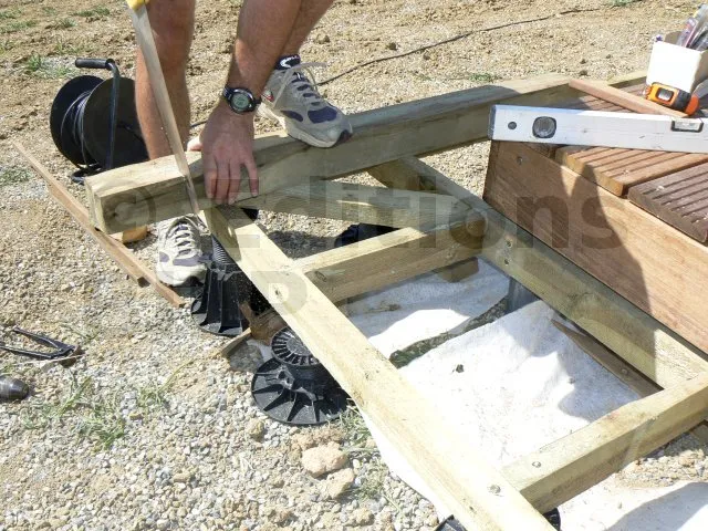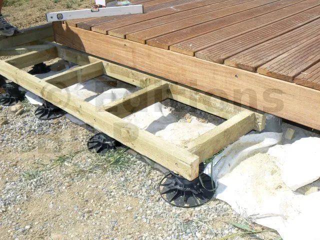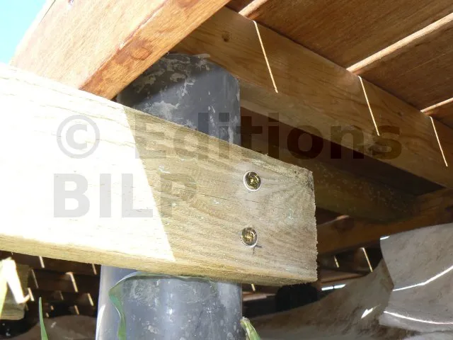Il s’agit d’un escalier réalisé dans l’angle d’une terrasse ; celle-ci étant posée sur lambourdes et plots en plastique et béton.