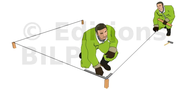 L’équerre du maçon est un accessoire très utile dans l’implantation d’une construction. Avec cet outil, prenez aussi 3 piquets pointus à fixer dans le sol, des pointes de 50 mm et un long cordeau. Commencer par fixer un piquet dans le sol, au-dessus une pointe de 50 et le bout du cordeau. Prendre ensuite une ligne droite avec le cordeau et piqueter. Enfin, avec l’équerre du maçon à la main, une personne va prendre le parallèle de la première ligne créée avec la première face de l’équerre et une autre tend le cordeau suivant l’autre face de cette équerre (perpendiculaire à la première). Les deux personnes s’aident en parlant pour trouver la bonne parallèle de cette seconde face de l’équerre. Vous pouvez donc planter le 3ème piquet suivant cette ligne perpendiculaire.