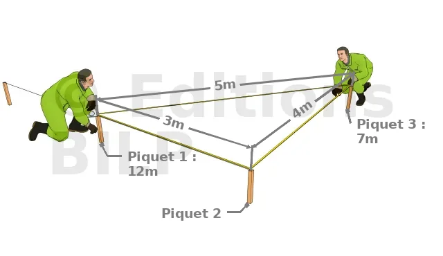 Pour cette méthode, il vous faut toujours 3 piquets, 3 pointes de 50 mm et un long cordeau et un décamètre. On fait ici appel au bon vieux théorème de Pythagore pour un triangle rectangle, soit la formule : hypoténuse ² = côté A ² + côté B ². En terme pratique, on utilise les chiffres 3, 4 et 5 et leur multiples respectifs 6,8 et 10 ; 9,12 et 15 etc. On essaye de trouver sur deux côtés adjacents les longueurs 3 et 4 m et une longueur 5 m en reliant leurs deux pointes.