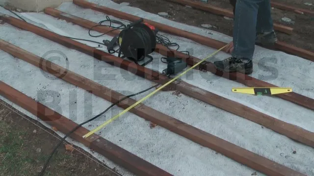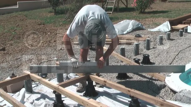 Une fois que les solives sont bien dans leur axe, on met à niveau les deux solives aux extrémités de la terrasse. On fait le niveau par rapport au niveau fini de la future terrasse, en retirant l’épaisseur d’une lame. Le niveau fini est probablement matérialisé par le seuil d’une porte ou d’une baie vitrée. Cela se fait avec une règle de maçon avec niveau ou avec un niveau laser.