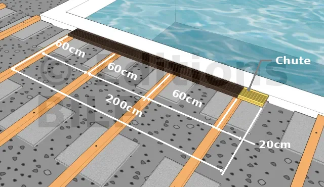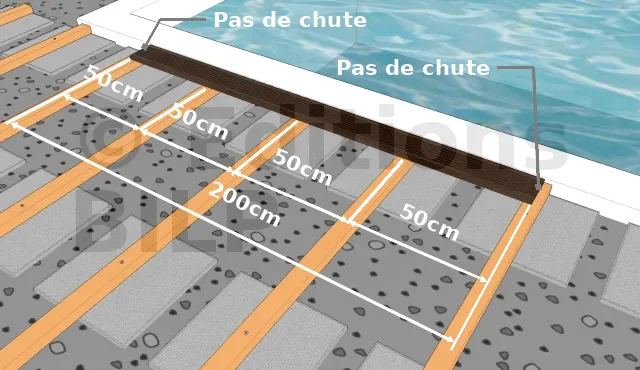 Exemple : nos lames mesurent 200cm de longueur. Le calcul de Emax nous donne 60cm. Si nous adoptons un E définitif à 60cm, il faudra recouper 20cm (200 / 60 = 3,333. Le 0,333 correspond à 20cm) en bout de chaque lame ; ce qui représente une perte importante sur toute la surface de la terrasse.