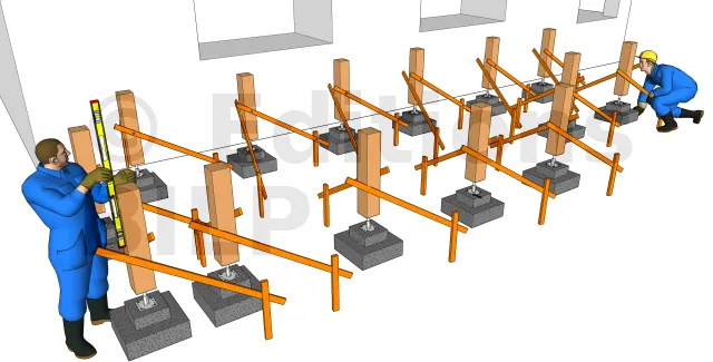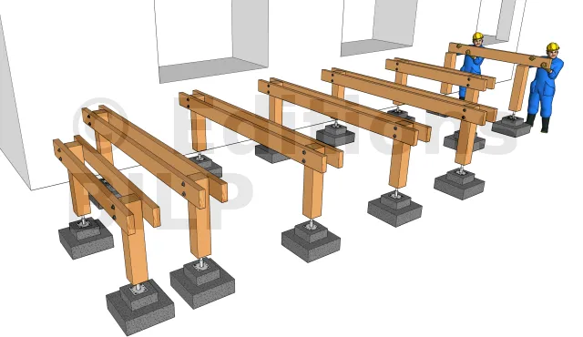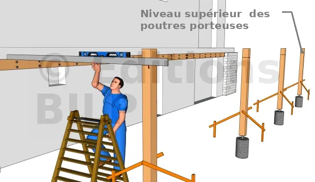 Pour obtenir le niveau exacte de la poutre porteuse, il faut placer une règle de maçon sur laquelle on met un niveau à bulle sur la poutre muralière. Par la suite, on trace le niveau inférieur de la règle et ce niveau correspondra au niveau supérieur de la poutre porteuse. De cette manière, le niveau de la poutre muralière et de la poutre porteuse seront les mêmes.