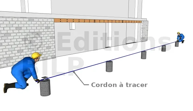 Le repérage se fait à l’aide de cordon à tracer. Pour ce faire, on place les deux pieds de poteau périphériques et on trace leur extrémité avec un cordon à tracer afin que l’emplacement des pieds de poteaux soient bien alignés.