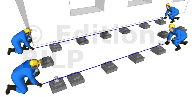 Marquage des emplacements des trous des pieds de poteaux sur les plots