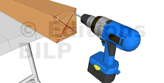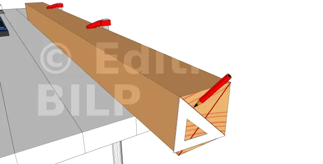 Cette étape consiste à tracer les deux diagonales d’une face à l’extrémité du poteau. Elles serviront de guide dans le cas ou les dimensions du pied de poteau ne seraient pas les mêmes que la section du poteau en bois.