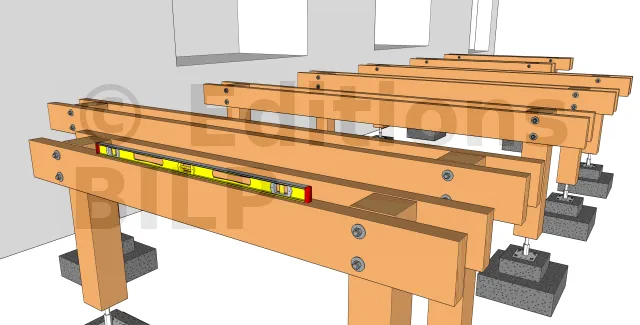 Etant donné que les poutres porteuses n’étaient pas horizontales, il est primordial de les mettre bien de niveau avant la fixation des solives. Pour ce faire, il vous suffira de tourner la molette du